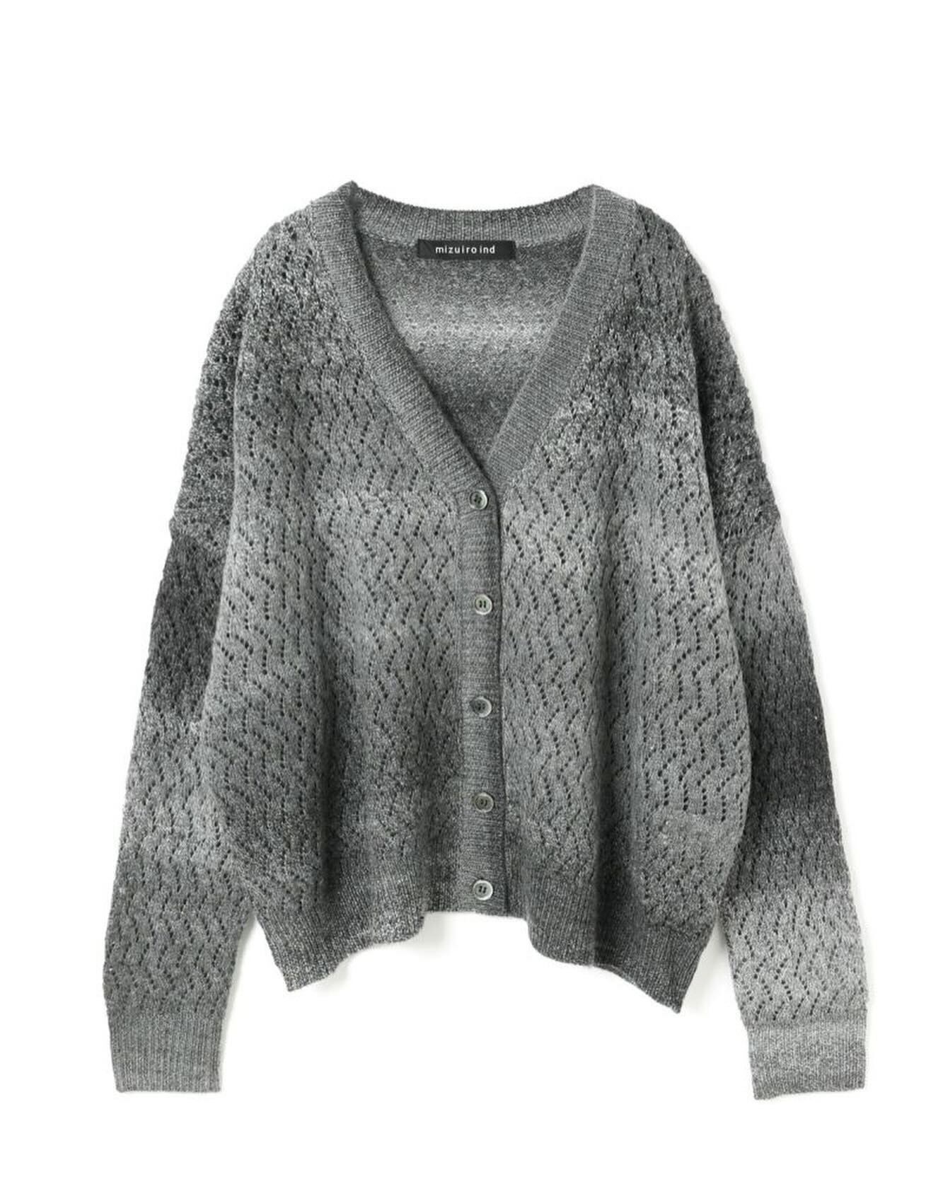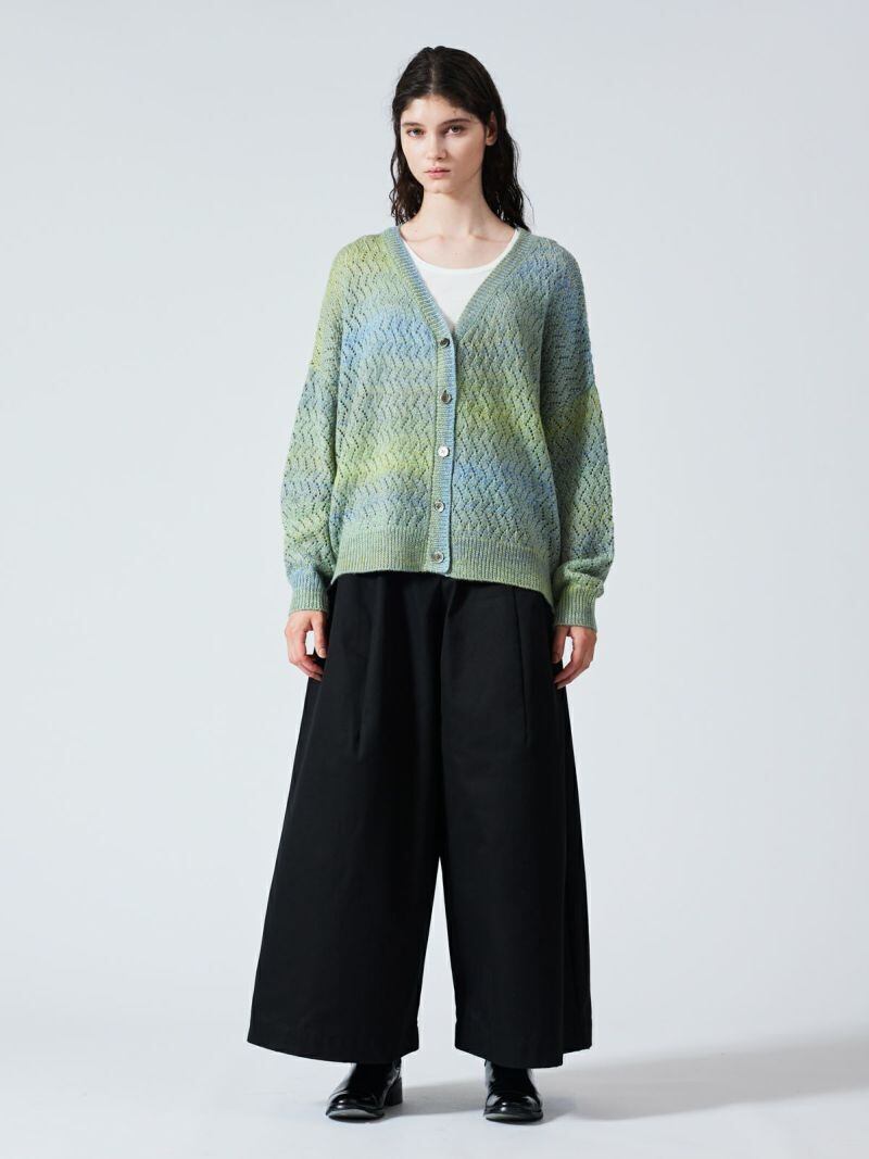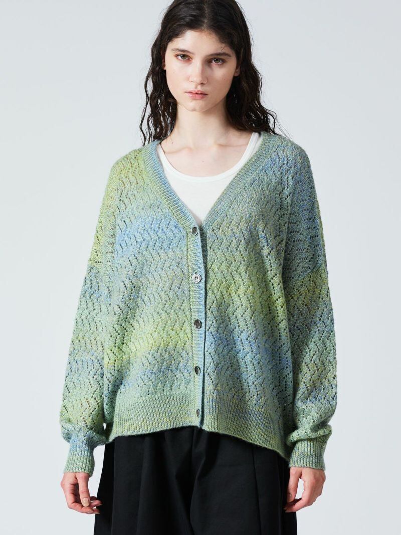 ヴィンテージライクなグラデーションが印象的な透かし編みのVネックカーディガンニット。ゆったりとしたワイドなシルエッとドロップショルダーでリラックス感のあるスタイル。ほどよい丈感でボトムス問わず合わせやすくコーディネートで活躍します。ウール混のあたたかなニット素材。ほどよい厚みでちくちくとしない肌触りの良さもポイント。グラデーションの出方は個体差がございます。